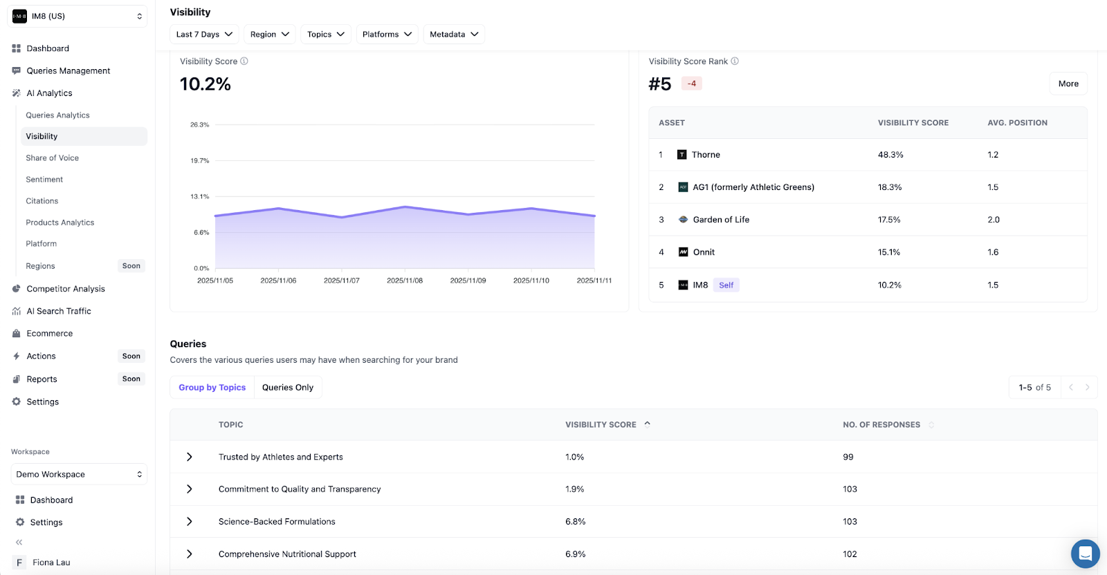 - Visibility metrics: Tracks visibility score, mention rate, and “average position” for tracked prompts.