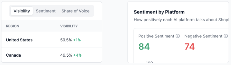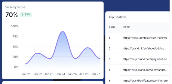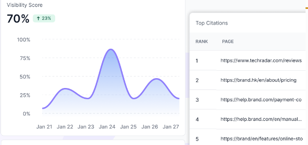 - Visibility score: Provides a summary metric showing your brand’s presence and influence across AI-generated output.