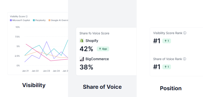 It focuses on brand mention visibility, position, and sentiment. This is helpful if you want direct brand mention insights without the complexity of enterprise-grade platforms.