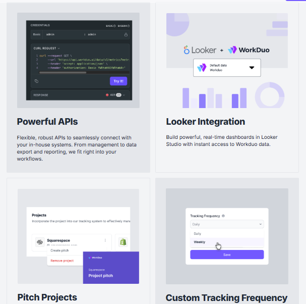 WorkDuo supports scalable brand mention tracking through APIs, Looker Studio dashboards, white-label solutions, and pitch projects.