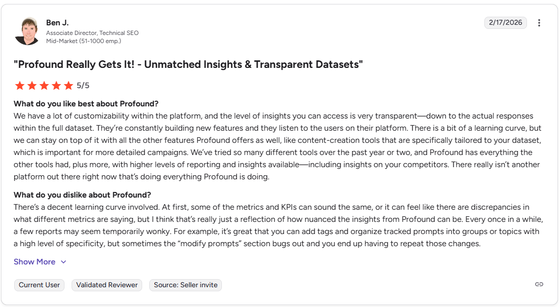 Ben J., Associate Director, Technical SEO at G2, said Profound offers strong customisability, transparent reporting down to full-response data, competitor insights and useful dataset-specific content tools, though it comes with a learning curve.