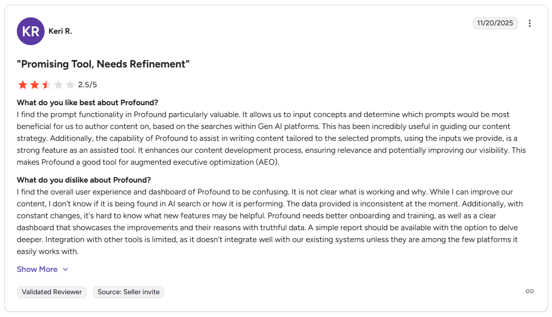 Keri R. described Profound as a promising tool with useful potential, but said its confusing dashboard, inconsistent data, limited integrations and weak onboarding make it hard to understand performance and use the platform effectively.