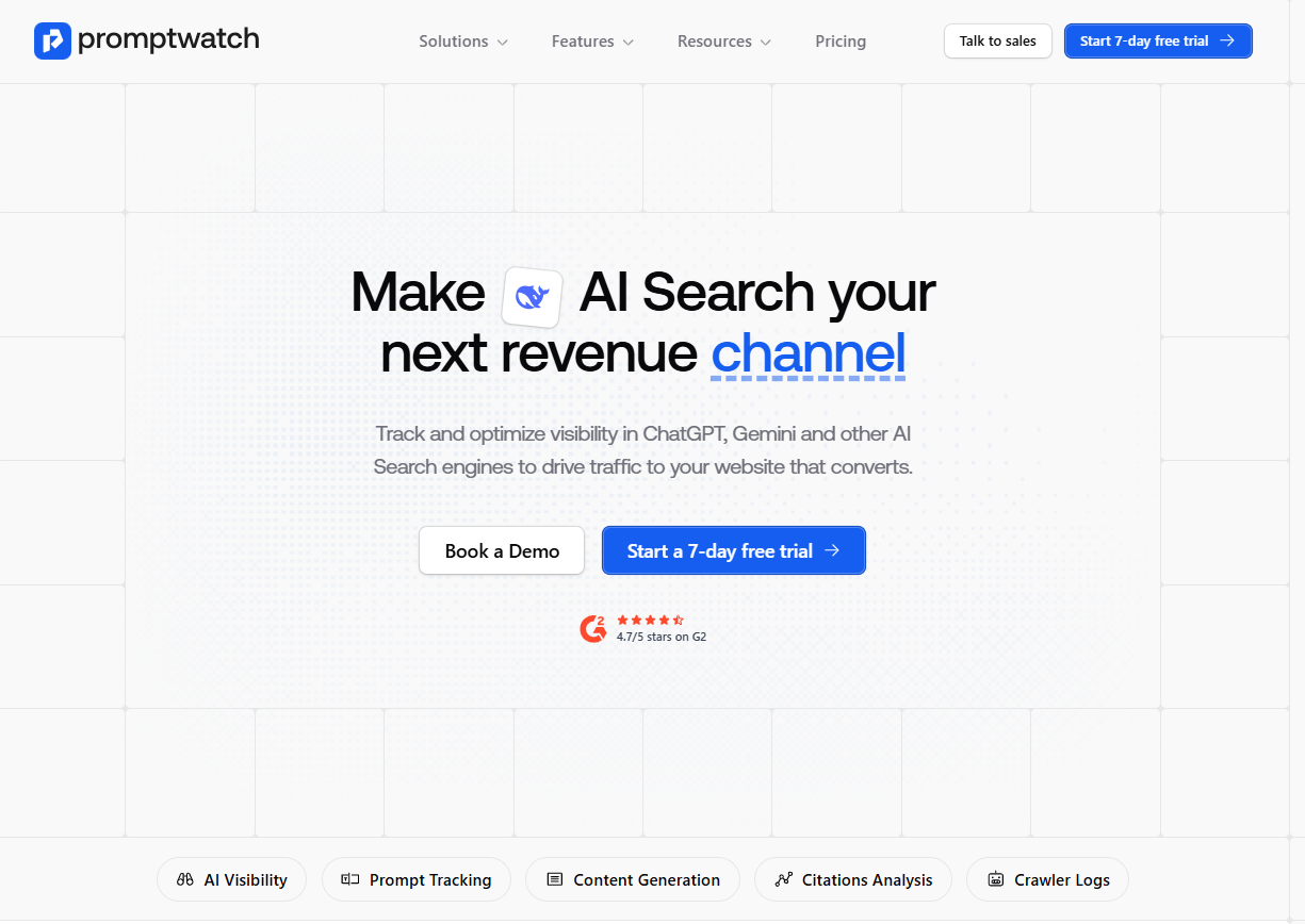 Promptwatch is an AI search visibility platform that helps brands track mentions, citations, prompts, and traffic across tools like ChatGPT, Gemini, Claude, Perplexity, Grok, and Google.
