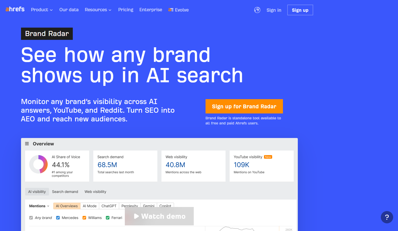 - Broader SEO context: Combines AI visibility with search demand, web visibility, and wider Ahrefs research tools.