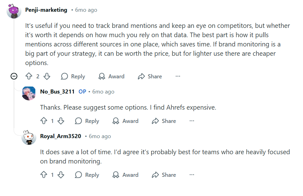 A Reddit user said Ahrefs’ Brand Radar is useful for tracking brand mentions and competitors in one place, but whether it is worth the price depends on how heavily your strategy relies on that data.