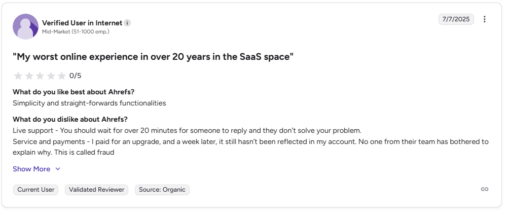 A verified G2 user said Ahrefs delivered a very poor customer experience, pointing to slow live support, unresolved account issues and frustration over a paid upgrade not being reflected properly.