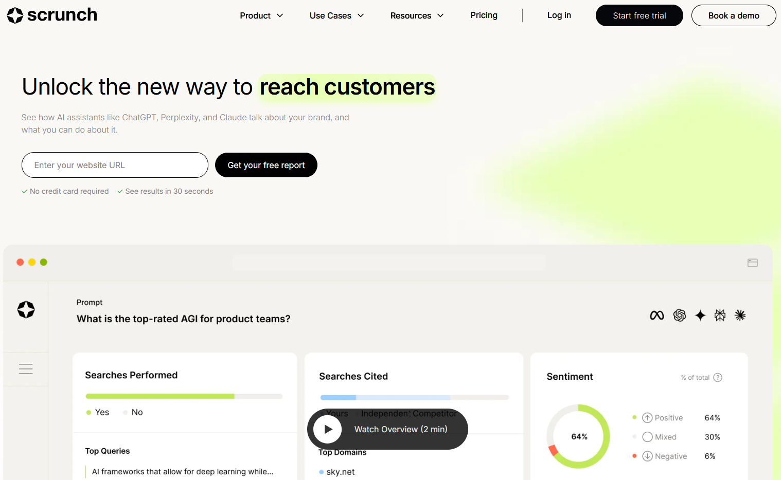 Scrunch is built for teams that want a closer read on how their brand performs across AI systems, with prompt monitoring, citation tracking, competitor analysis, and AI bot activity all in one place.