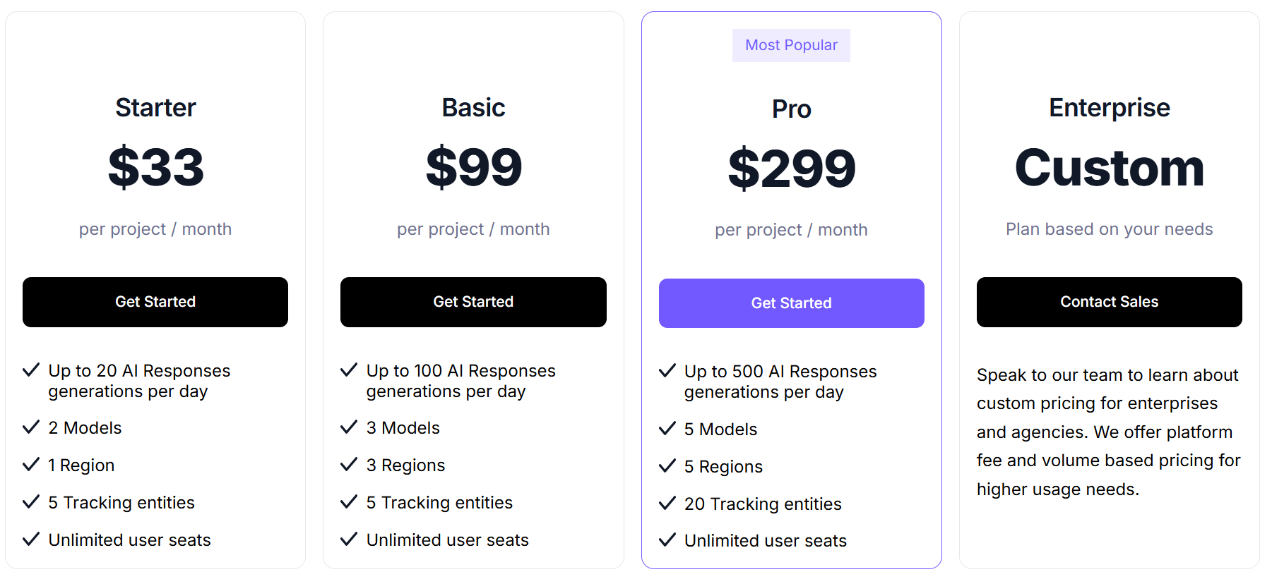 • Limited regional/language tracking on lower tiers: Starter/Growth can be restricted to a single region/language, pushing global tracking into custom Enterprise pricing.