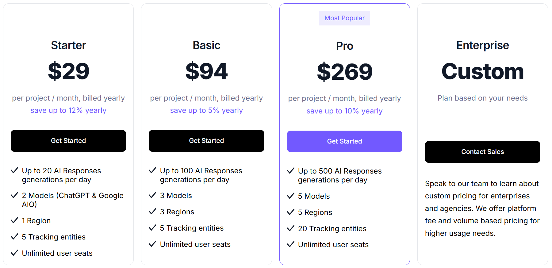 • WorkDuo starts at $33 per project per month, with more included responses, multi-model tracking, and unlimited seats, making it a cost-efficient alternative.