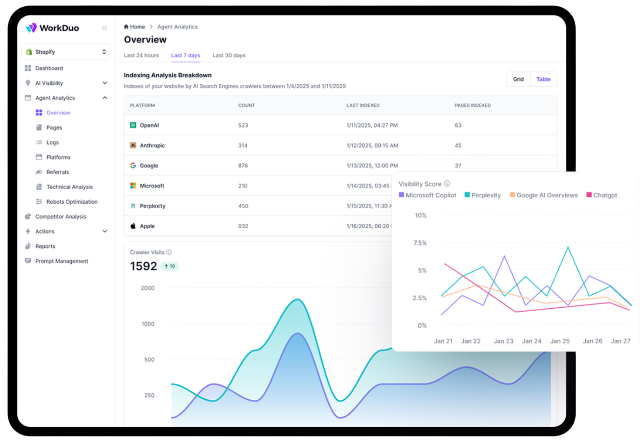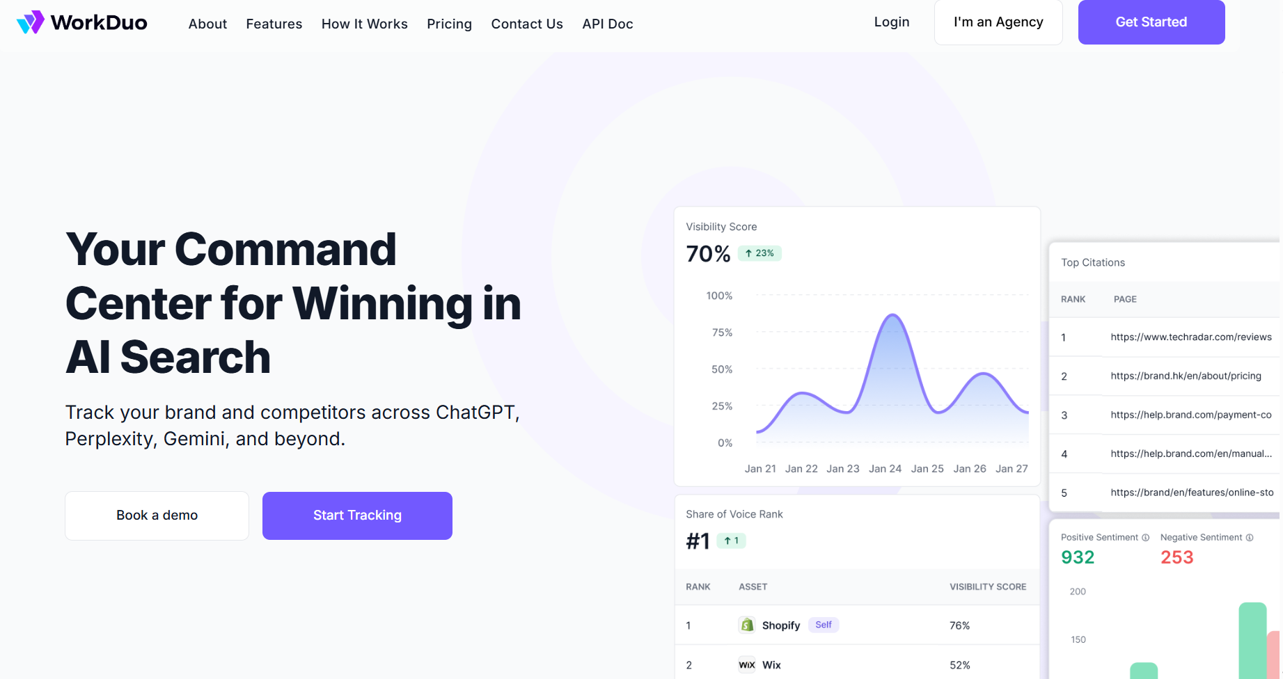 If an affordable GEO tool is the priority, WorkDuo is worth considering. It acts as a data intelligence and analytics platform for AI search visibility, helping brands and agencies understand how AI systems interpret and surface their data.