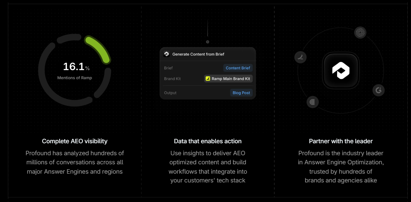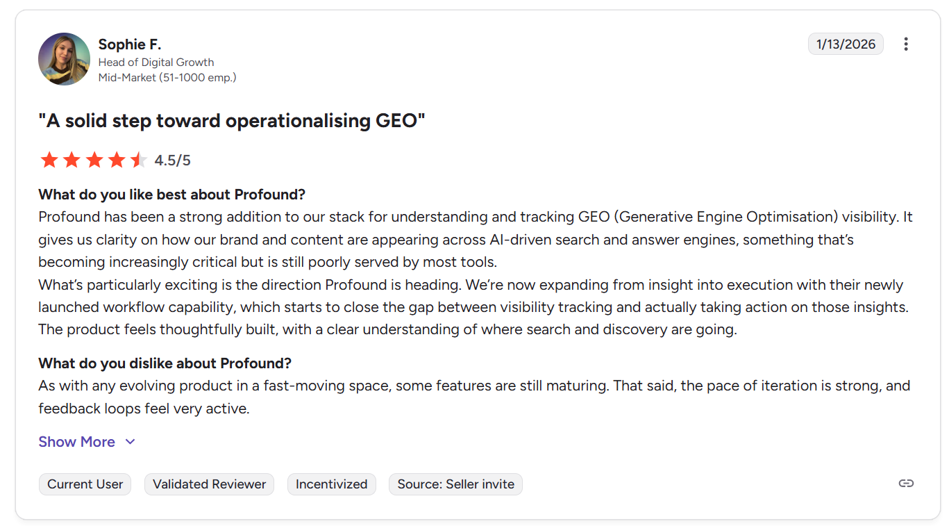 • Sophie F., Head of Digital Growth, wrote on G2 that Profound AI helps track GEO visibility across AI answer engines, and its new workflows make it easier to act on those insights.