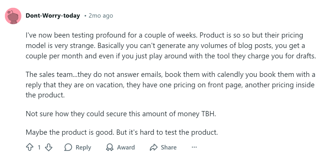 • A Reddit user said Profound AI feels average so far, but the pricing is confusing and restrictive (limited posts, charges for drafts), sales responsiveness is poor, and mismatched pricing makes it hard to properly test the product.