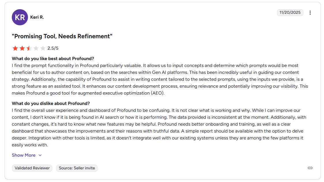 • Another G2 user says Profound AI’s dashboard is confusing and inconsistent, results aren’t transparent, onboarding is weak, changes are hard to track, and integrations are limited.
