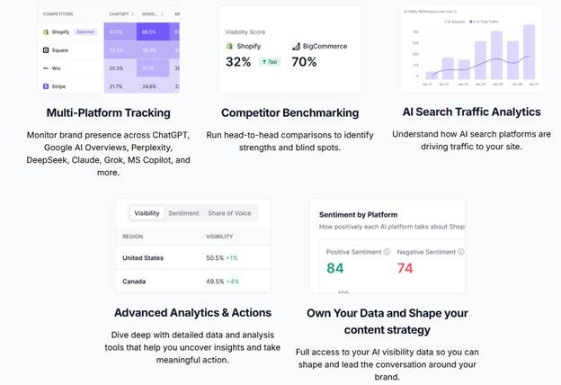 A comprehensive platform that tracks where and how your brand is cited across major AI answer engines (like ChatGPT, Perplexity, Gemini, Claude, and more), with deep dashboards, competitor benchmarks, and sentiment insights.